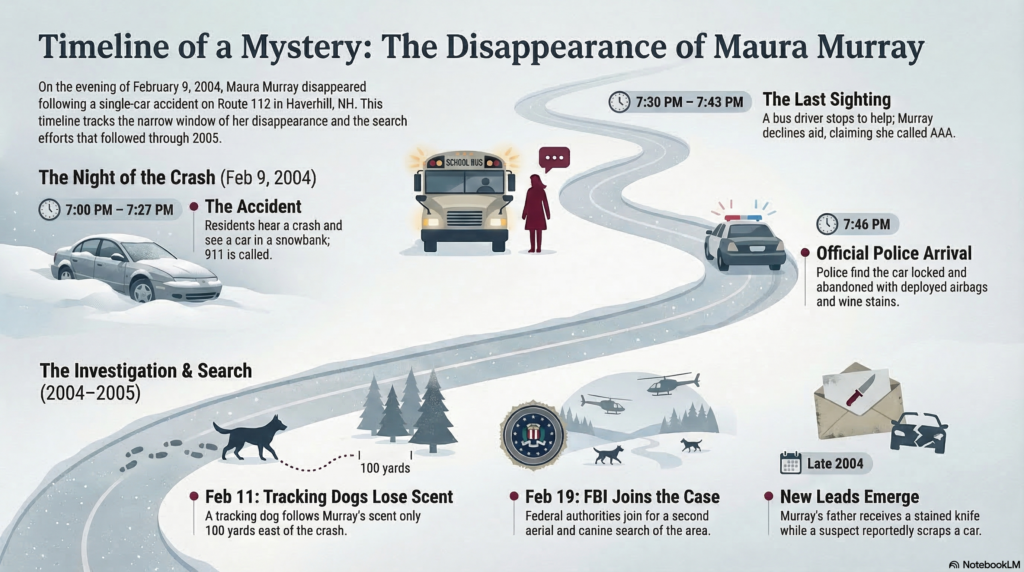 Maura Murray vanished on a snowy night in February 2004, leaving behind a wrecked car, unanswered questions, and one of the most confounding unsolved cases of the internet era. Was it an accident? Foul play? A planned disappearance?